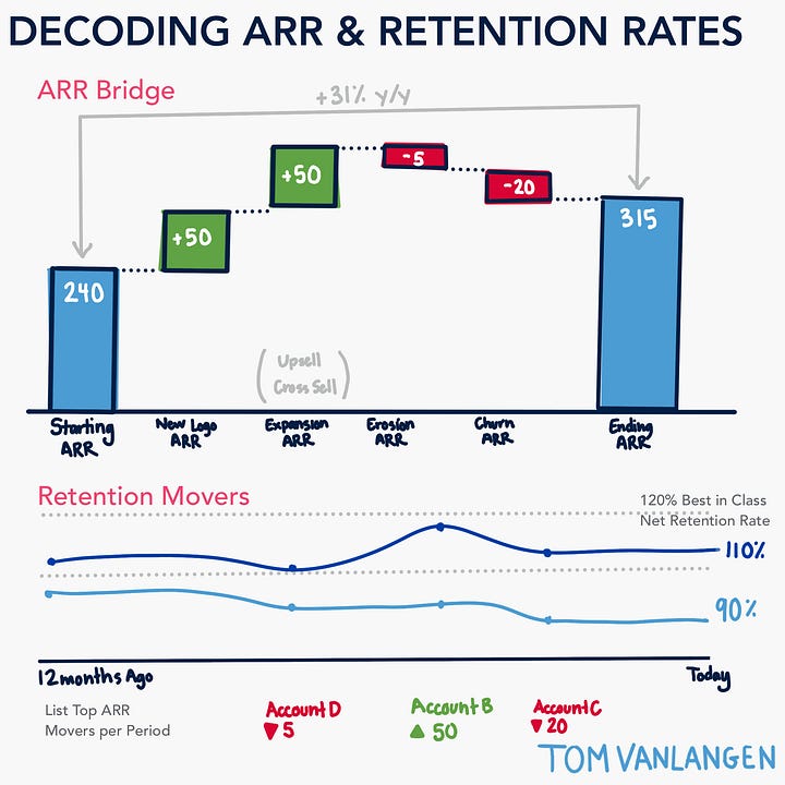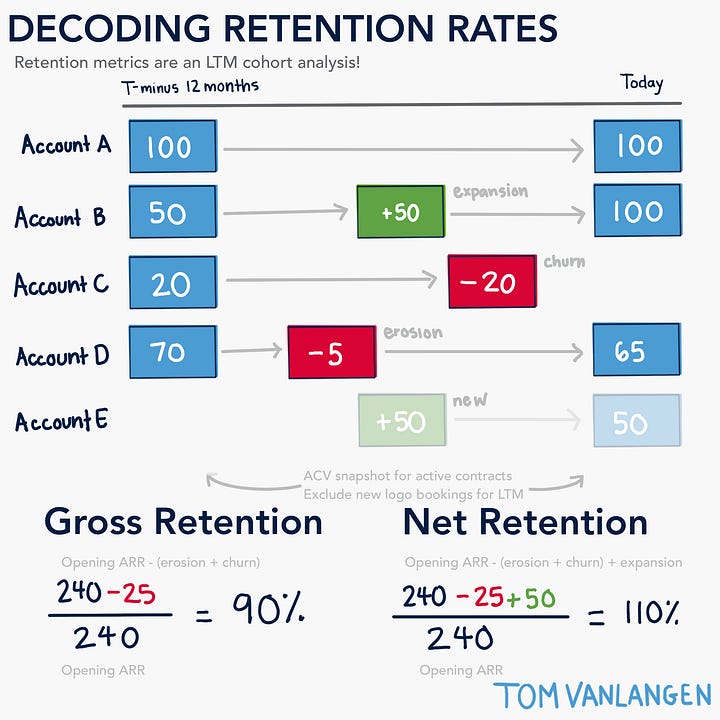 In my last post, I decoded the ARR and its components. With the expansion, erosion, and churn components, you have what you need to calculate a Gross Retention Rate and Net Retention Rate. Here are the underpinnings of the calculation.